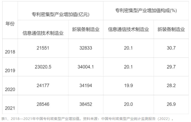 按照國家統計局發布的《知識產權(專利)密集型產業統計分類(2019)》,裝備制造業共有121個工業小類行業被納入知識產權(專利)密集型產業統計,涵蓋信息通信制造業、新裝備制造業、醫藥醫療產業、環保產業。2021年,在專利密集型產業中,信息通信技術制造業、新裝備制造業合計占專利密集型產業增加值的46.9%(見表1)。與2016—2020年相比,2017—2021年,專利密集型產業中的信息通信技術制造業,發明專利密集度從190件/萬人提高到226件/萬人;專利密集型產業中的新裝備制造業,發明專利密集度從225件/萬人提高到262件/萬人。