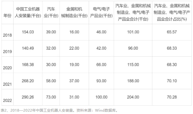 一般而言,裝備制造業綠色化、智能化水平主要體現在能源消費和工業機器人使用上。在綠色化轉型方面,2012—2021年,我國裝備制造業的能源消費強度(億元產出的能源消費總量)從648.16噸標煤/億元下降到596.27噸標煤/億元。在能源強度下降的同時,電力消費強度總體上看出現了上升,反映出裝備制造業能源消費結構的變化。在裝備制造業8個子行業中,除了金屬制品業和儀器儀表制造業以外的6個行業都出現了電力消費強度的上升。在智能化推進方面,裝備制造業集中了數智化轉型程度最高的工業行業。根據國際機器人聯合會的數據,2018—2022年,中國工業機器人安裝量從154.03千臺增加到290.26千臺,其中,歸屬裝備制造業的汽車業、金屬和機械制造業、電氣/電子產品業安裝量從101千臺增加到204千臺,合計占比超過2/3(見表2)。