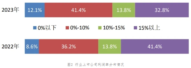 3、行業上市公司利潤率、毛利率與加權平均凈資產收益率2023年,行業上市公司的利潤率(利潤率=利潤總額/營業收入)為7.6%,同比下降0.3個百分點。其中,20家同比增長,占34.5%;38家同比下降,占65.5%。毛利率為27.3%,同比增長0.2個百分點。其中,21家同比增長,占36.2%;37家同比下降,占63.8%。各分行業2023年的利潤率和毛利率情況見表4。