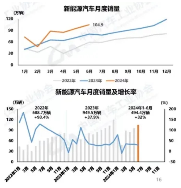 新能源汽車繼續保持較快增長。6月,新能源汽車產銷分別完成100.3萬輛 和104.9萬輛,同比分別增長28.1%和30.1%,市場占有率達到41.1%。1-6月,新能源汽車產銷分別完成492.9萬輛和494.4萬輛,同比分別增長30.1%和32%,市場占有率達到35.2%。