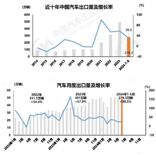 汽車出口同比快速增長。6月,汽車出口48.5萬輛,環比增長0.7%,同比增長26.9%。分車型看,乘用車出口40.3萬輛,環比增長1.4%,同比增長29.1%;商用車出口8.2萬輛,環比下降2.5%,同比增長16.9%。1-6月,汽車出口279.3萬輛,同比增長30.5%。分車型看,乘用車出口233.9萬輛,同比增長31.5%;商用車出口45.4萬輛,同比增長25.7%。