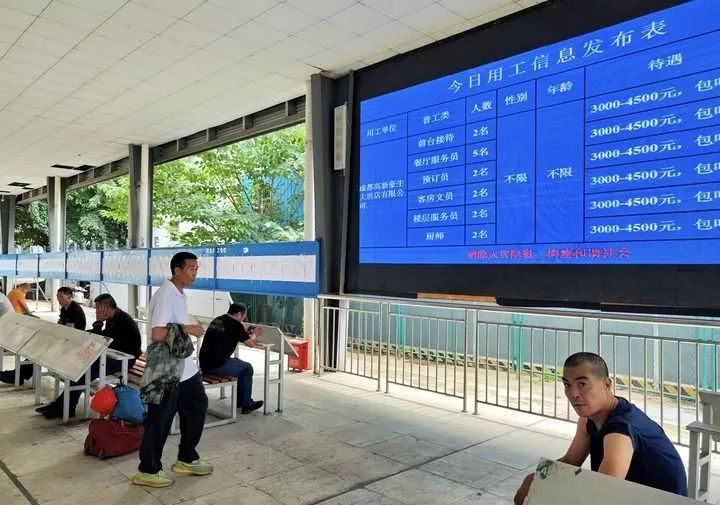 6月17日,成都錦江區人力資源市場,一塊大屏幕滾動播放著企業招工信息,大屏幕兩旁的公告欄張貼著企業的招工啟事。
