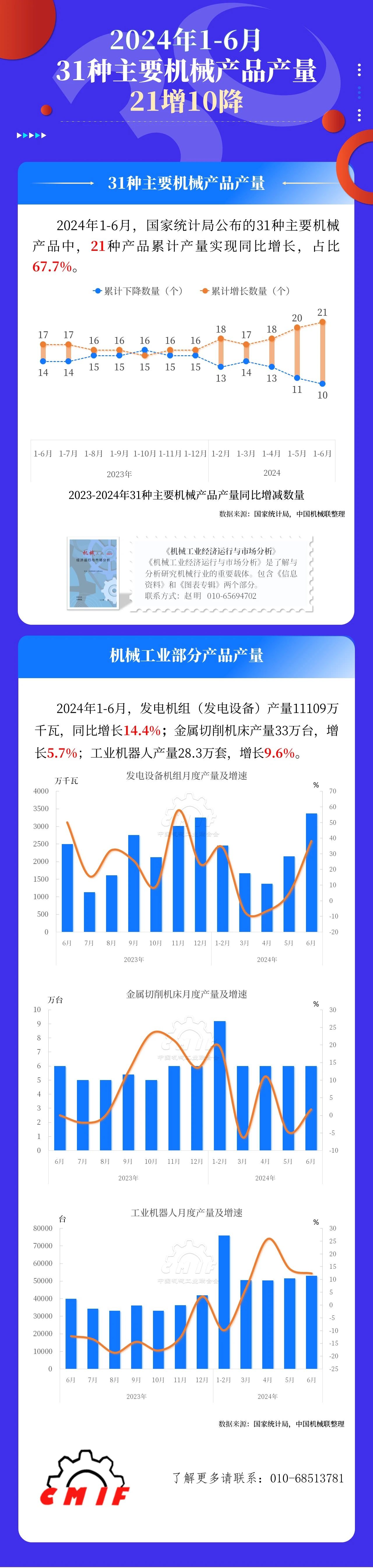 2024年1-6月,國家統(tǒng)計局公布的31種主要機械產(chǎn)品中,21種產(chǎn)品累計產(chǎn)量實現(xiàn)同比增長,占比67.7%。