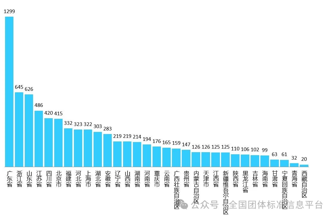 截至2024年7月31日,廣東省、浙江省、山東省、江蘇省等31個省、自治區、直轄市的社會團體在全國團體標準信息平臺注冊,其中廣東省社會團體注冊數最多,為1299家,占社會團體注冊總數的14.3%。