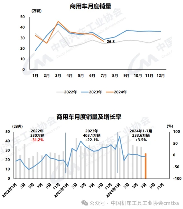 7月,商用車(chē)產(chǎn)銷(xiāo)分別完成25.6萬(wàn)輛和26.8萬(wàn)輛,環(huán)比分別下降22.4%和20.4%,同比分別下降10.5%和6.6%。在商用車(chē)主要品種中,與上月相比,客車(chē)和貨車(chē)產(chǎn)銷(xiāo)均呈兩位數(shù)下降;與上年同期相比,客車(chē)和貨車(chē)產(chǎn)銷(xiāo)均呈不同程度下降。