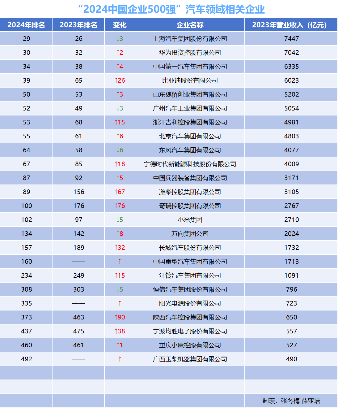 具體到汽車及相關領域,共有上汽、一汽、比亞迪、廣汽、吉利、北汽、東風、寧德時代、奇瑞等約24家相關企業上榜,其中5家入圍50強,18家相比去年排名上升。上汽集團以7447億元營收位列第一,排名500強榜單第29位,但相比去年下降了3位。