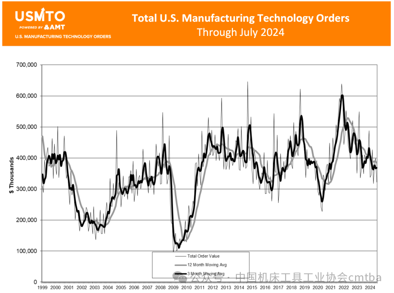 1-7月,日本機(jī)床訂單總額為8640億日元,同比減少2.1%。美國(guó)機(jī)械制造技術(shù)協(xié)會(huì)(AMT)發(fā)布數(shù)據(jù)顯示,7月制造技術(shù)訂單總額3.217億美元,環(huán)比下降19.3%,同比下降7.8%,1-7月訂單總額達(dá)到25.3億美元,同比下降10.5%。