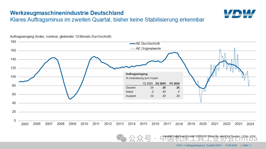 德國(guó)機(jī)床制造商協(xié)會(huì)(VDW)發(fā)布數(shù)據(jù)顯示,今年第二季度德國(guó)機(jī)床行業(yè)訂單同比下降28%,其中,國(guó)內(nèi)訂單下降13%,國(guó)外訂單下降33%。2024年上半年,訂單同比下降了26%,其中,國(guó)內(nèi)訂單下降7%,國(guó)外訂單下降33%。預(yù)計(jì)2024年的整體訂單量仍將大幅下降。VDW的預(yù)測(cè)合作伙伴Oxford Economics預(yù)計(jì),2025年和2026年所有地區(qū)的機(jī)床需求將出現(xiàn)明顯的廣泛復(fù)蘇。