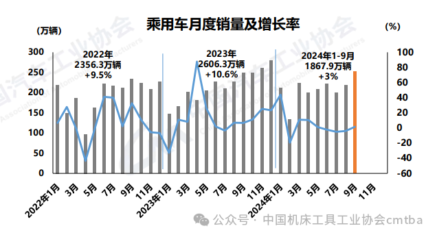 9月,汽車產(chǎn)銷分別完成279.6萬(wàn)輛和280.9萬(wàn)輛,環(huán)比分別增長(zhǎng)12.2%和14.5%,同比分別下降1.9%和1.7%。1-9月,汽車產(chǎn)銷累計(jì)完成2147萬(wàn)輛和2157.1萬(wàn)輛,同比分別增長(zhǎng)1.9%和2.4%。