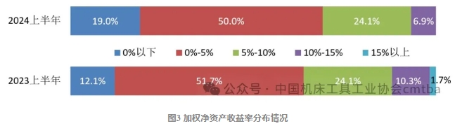 加權(quán)平均凈資產(chǎn)收益率分布情況見圖3。與上年同期相比,加權(quán)平均凈資產(chǎn)收益率0%以下的企業(yè)數(shù)占比上升6.9個(gè)百分點(diǎn); 0%-5%占比下降1.7個(gè)百分點(diǎn);5%-10%占比持平; 10%-15%占比下降3.4個(gè)百分點(diǎn);15%以上占比下降1.7個(gè)百分點(diǎn)。