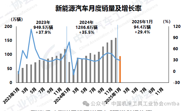 1月,新能源汽車同比繼續保持較快增長。當月,新能源汽車產銷分別完成101.5萬輛和94.4萬輛,環比分別下降33.7%和40.9%,同比分別增長29%和29.4%,新能源汽車新車銷量達到汽車新車總銷量的38.9%。