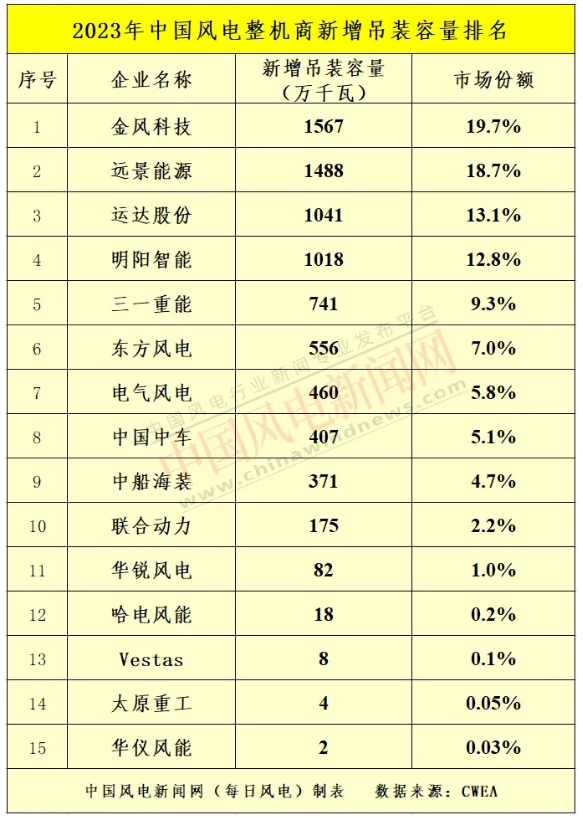 2024年,中國風電市場有新增裝機的整機制造企業共13家,新增裝機容量8699萬千比,前5家市場份額合計為75%,前10家市場份額合計為98.6%。其中:金風科技以1867萬千瓦新增裝機位居第一,占比21.5%;遠景能源1363萬千瓦位居第二,占比15.7%;明陽1229萬千瓦位居第三,占比14.1%。