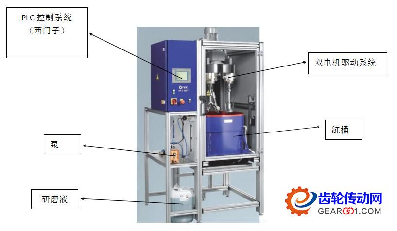 加工時齒輪沉入磨料內(nèi),在裝有磨料的缸筒內(nèi)做環(huán)狀運(yùn)動,通過與磨料顆粒的互相摩擦起到互相研磨和拋光的作用。粗研+精研+拋光的全過程齒輪只需一次裝夾,分三次更換缸桶,用裝有不同的磨料分別進(jìn)行粗、精研磨和拋光。缸桶及磨料不轉(zhuǎn),通過控制系統(tǒng)控制雙電機(jī)驅(qū)動系統(tǒng)實現(xiàn)齒輪的正、反轉(zhuǎn),帶動和實現(xiàn)齒輪在磨料缸桶內(nèi)旋轉(zhuǎn),以實現(xiàn)齒輪的研磨和拋光。