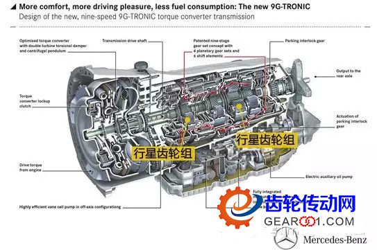 奔馳全新的9G-TRONIC 9速縱置自動變速器結構示意圖,它已經布置了4組行星齒輪組,從結構看,要進一步增加擋位是在難度太大(而且意義也不是太大)