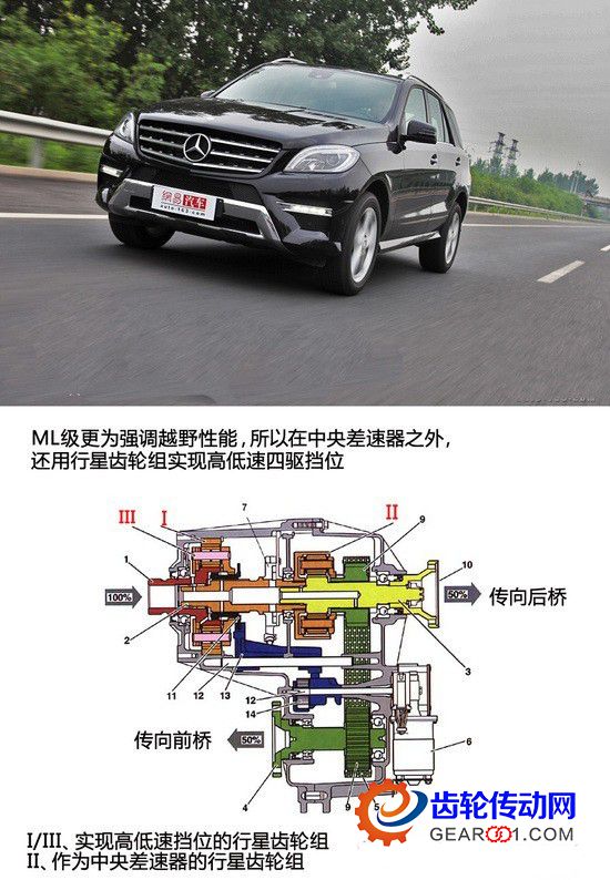 上面說的是四驅系統的中央差速器,除了中央差速器之外,具備高、低速四驅模式的SUV車型也可以通過行星齒輪組實現四驅的高低速擋位——這主要見于一些兼顧越野性能的SUV車型,比如奔馳ML、豐田蘭德酷路澤等等。這個時候行星齒輪組的作用與CVT變速器中的行星齒輪組控制模式和功用比較類似。