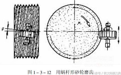 為了提高磨齒的生產(chǎn)效率,可以采用蝸桿形砂輪磨齒(圖1-3-12),其加工原理與滾齒類似。由于連續(xù)分度以及很高的砂輪轉速,所以生產(chǎn)率很高。但是,蝸桿形砂輪的修整很困難,故目前應用尚少。