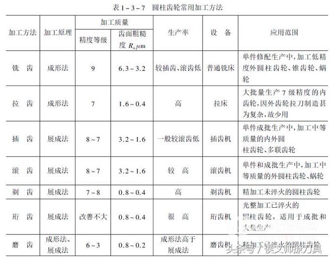 齒輪齒形加工方法的選擇,主要取決于齒輪精度和齒面粗糙度的要求以及齒輪的結構、形狀、尺寸、材料和熱處理狀態(tài)等。表1-3-7所列出的9~4精度圓柱齒輪常用的最終加工方法,可作為選擇齒形加工方法的依據(jù)和參考。