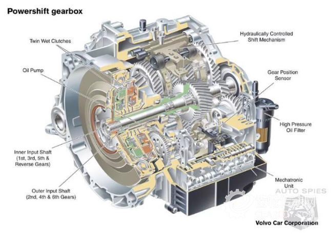 2007年格特拉克第一代雙離合變速器6DCT450誕生,福特稱之Powershift。這臺濕式雙離合變速箱與大眾的DQ250最大不同在于離合器模塊的結構,6DCT450的離合器模塊內的兩套離合器以平行的方式進行排列,更有利于散熱。