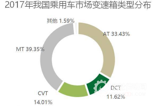 2017年,我國狹義乘用車銷量達2400萬多輛,AT車型的份額仍然最大,達到33.43%,然后是CVT和DCT,占比分別是14.01%和11.62%。